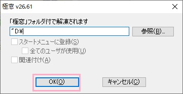 ダウンロードした「gm_2661.exe」を実行すると解凍先フォルダの指定画面が表示されるので、極窓を展開するフォルダを選択して「OK」をクリックしましょう。