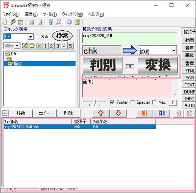作成されたフォルダ内の「極窓.exe」起動すると、画像のようなウィンドウが表示されます。ウィンドウ下部のリストに.CHKファイルをドラッグ&ドロップしたら、「判別」ボタンをクリックしましょう。右側に元の拡張子が表示されるので、「変換」ボタンをクリックすれば元の拡張子へと復元することができますよ。