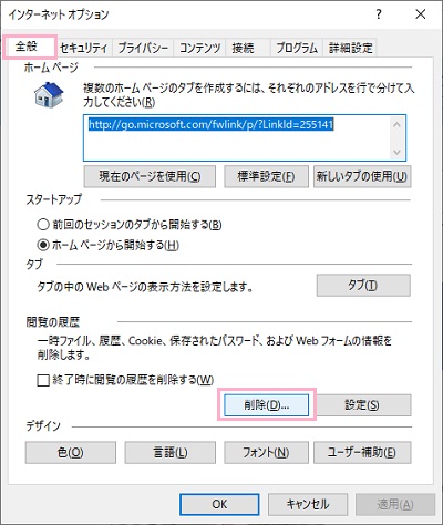 インターネットオプションが表示されるので、「全般」タブをクリックして開き、「閲覧の履歴」項目の「削除」をクリックしましょう。