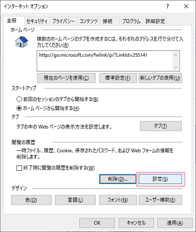 IEのウィンドウ右上にある設定ボタンからメニューを開き、「インターネットオプション」をクリックして開きます。インターネットオプションが表示されたら「全般」タブをクリックして開き、「閲覧の履歴」項目の「設定」をクリックしましょう。