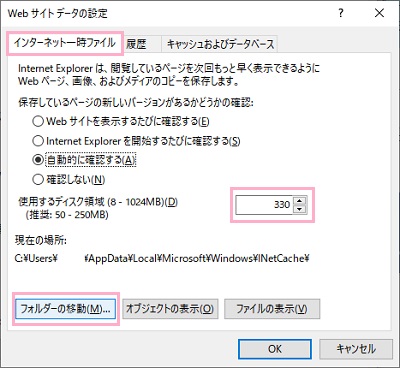 「Webサイトデータの設定」ウィンドウが表示されるので、「インターネット一時ファイル」タブをクリックして開き、「使用するディスク領域」でキャッシュ容量を設定します。あとは「フォルダーの移動」をクリックしてキャッシュを保存するフォルダーを指定して「OK」をクリックすれば設定完了です。
