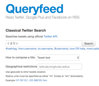 海外のサイトですが、QueryFeedという外部サービスを利用することでツイッターの情報をRSSの形式に変換をすることができます。順番にやり方を見ていきます。