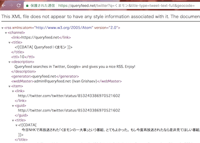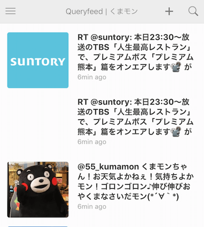 すると、出ました!「くまモン」です!!「くまモン」というテキストがツイートに含まれるツイートをRSSを通して取得してきています。