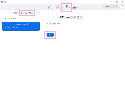 クラウドサーバーに録画したファイルは、ミーティングの「開く」ボタンをクリックすることでクラウドサーバーに保存した録画ファイルを再生することができます。ファイルをダウンロードしたい場合は、下記リンク先のZoomウェブポータルにアクセスして「マイ録画」ページのミーティング一覧から「ダウンロード」をクリックすることでダウンロードすることができますよ。