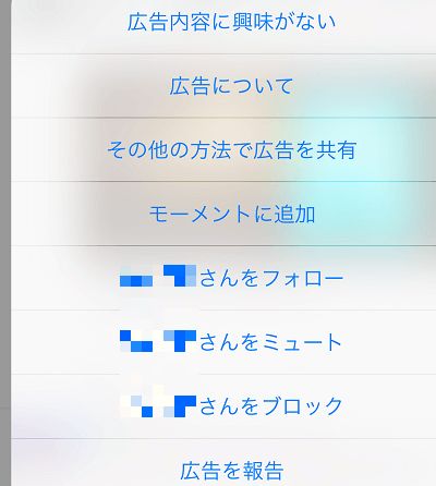 「ミュート、ブロック、広告内容に興味がない」のどれかを選ぶ