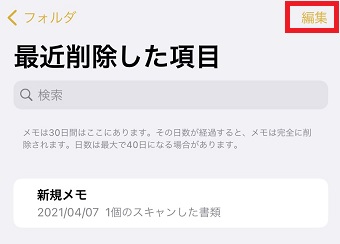 『最近削除した項目』が開いたら右上の『編集』をタップします。