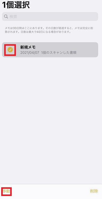 復元したいメモにチェックを入れ下の『移動』をタップします。