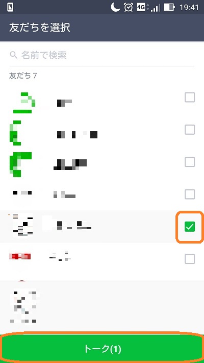 (2)次の画面で招待する友達を選択できます。 (3)「トーク」をタップします。 複数人の友だちを招待することができます。 すると3人以上でトークをすることができます。 同じようなやり方で、もっと多くの人を招待することができます。