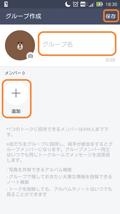 (2)この画像のような画面になります。 好きな「グループ名」を記入し、必要があれば画像も選択しましょう。 (3)「追加」をタップするとグループに招待できる友だちを選択することができます。
