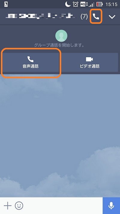 (1)グループの「トーク」画面から、右上の「電話マーク」をタップします。