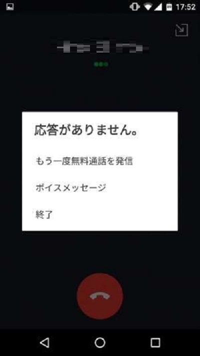 電話をかけて相手が出ないときに、 一定時間が経つと「応答がありません」という画面が表示されます。 「再度発信する」「ボイスメッセージを残す」「終了する」かを選択できます。