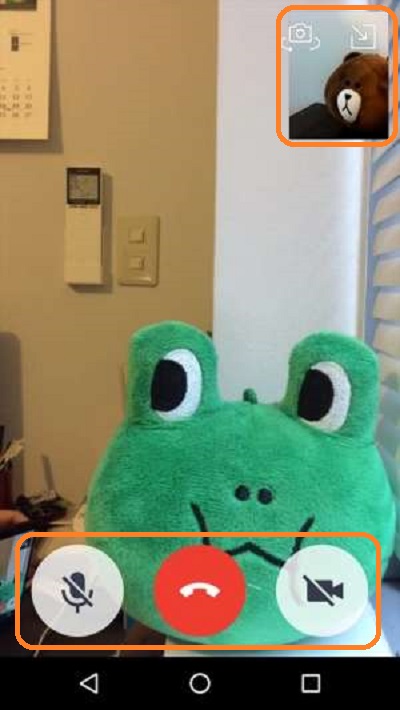ビデオ通話中の画面は、 インカメラで自分側の映像が表示されています。
