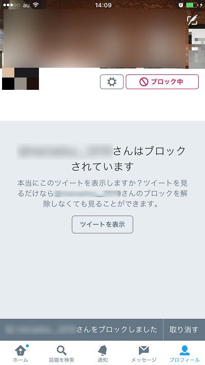 「○○さんをブロックする」を押すことで、このような画面になります。もしも、ブロックを取り消したい場合は、下部の「取り消す」をタップしましょう。
