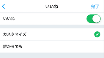 「いいね」がついた場合に通知を受け取るかどうかのチェックと、誰からのいいねで通知を受け取るかを選択できます。