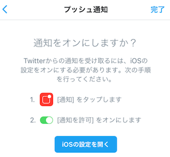 この場合は設定アプリから通知を許可する必要がありますので、[iOSの設定を開く]のボタンをタップして通知を許可するようにしてから、Twitterの設定に戻りましょう。