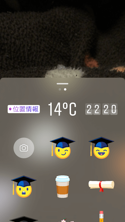 画像にあるようにインスタ独自の絵文字を使用できます。また位置情報をリンクさせた理、その時のリアルな気温や時間のスタンプも用意されています。