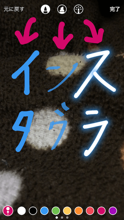 自由にペンで落書きすることができます。カラーは下から選んでください。上部にある3つのアイコンからペンの種類を選ぶことができます。