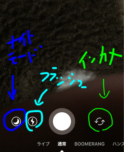 画像に書き込んでいるように、夜くらい時にはナイトモード、フラッシュが必要な時はフラッシュ、インカメを使いたい時はインカメと用途やシーンに合わせて設定を変えてください。