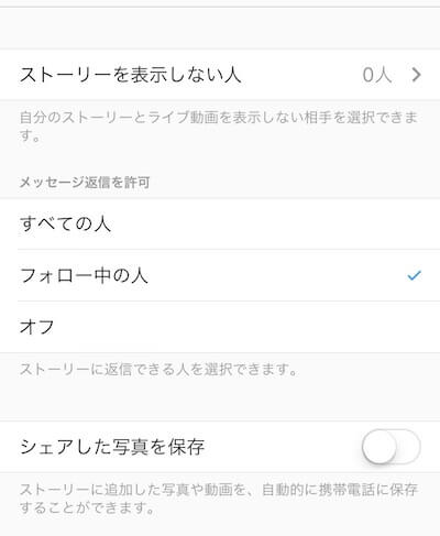 また、ストーリーを投稿した際に自動で動画や静止画を端末に保存することも設定次第で可能です。ストーリーをみた人から送られてくるメッセージも許可制に設定可能です。