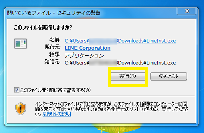 (1)上のリンクからPC版LINEをダウンロードすると、 このような画面が出てきます。 「実行(R)」をクリックします。