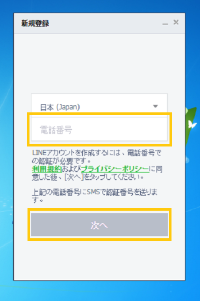 PC版LINEをダウンロードすると、このような画面が表示されます。 (1)「新規登録」をクリックします。