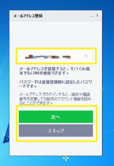 (※)スマホなどでログインして使う予定がある人は、 メールアドレスを登録しておきましょう。 メアドを登録しない人は、「スキップ」をクリックします。