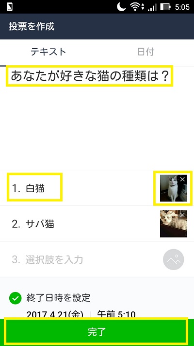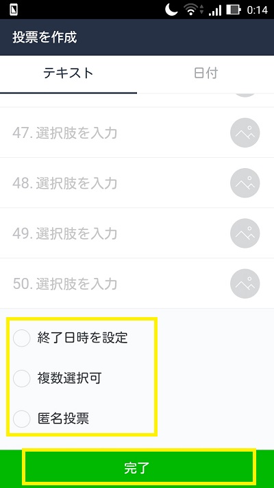 (5)必要に応じてアンケートの「終了日時を設定」「複数選択可」「匿名投票」を設定します。