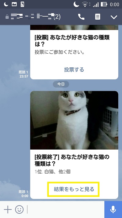 (1)グループのトーク画面にこのように通知されます。 「結果をもっと見る」をタップして、アンケート内容を確認してみましょう。
