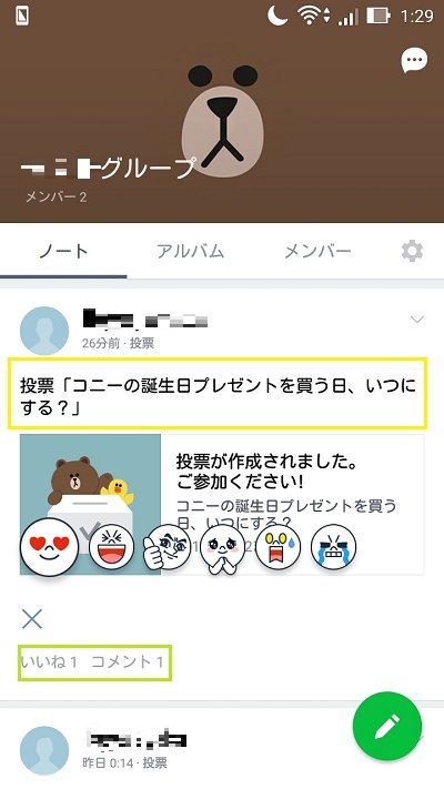 ・アンケートはタイムラインではなく、グループの「ノート」と「トーク」から確認できます。