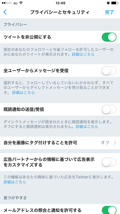 「○を右に移動する事で、背景が緑になりオンになる」と言う風ですね。後は、プロフィール画面に戻り、鍵垢になっているかを確認して下さい。