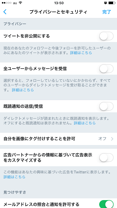 ○を左に移動する事で、「ツイートを非公開にする」がオフになり、鍵の「外し方・解除方法」が完了します。