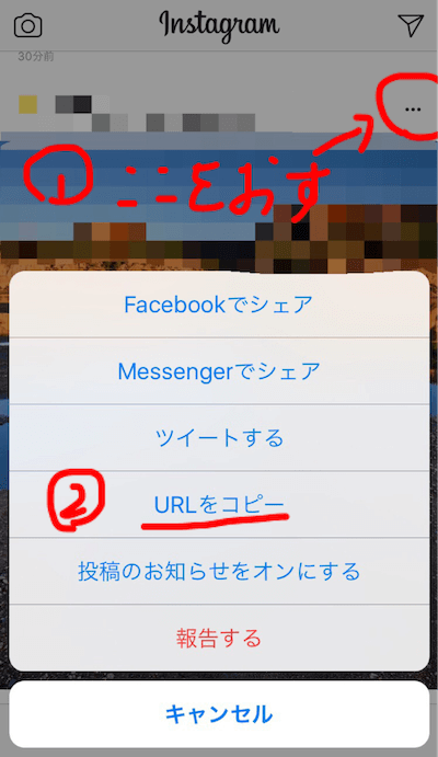 インスタを開いたら、リポストしたい画像を選んで、画像のように①右上の赤丸で囲った部分を押して、②URLをコピーをタップしてください。