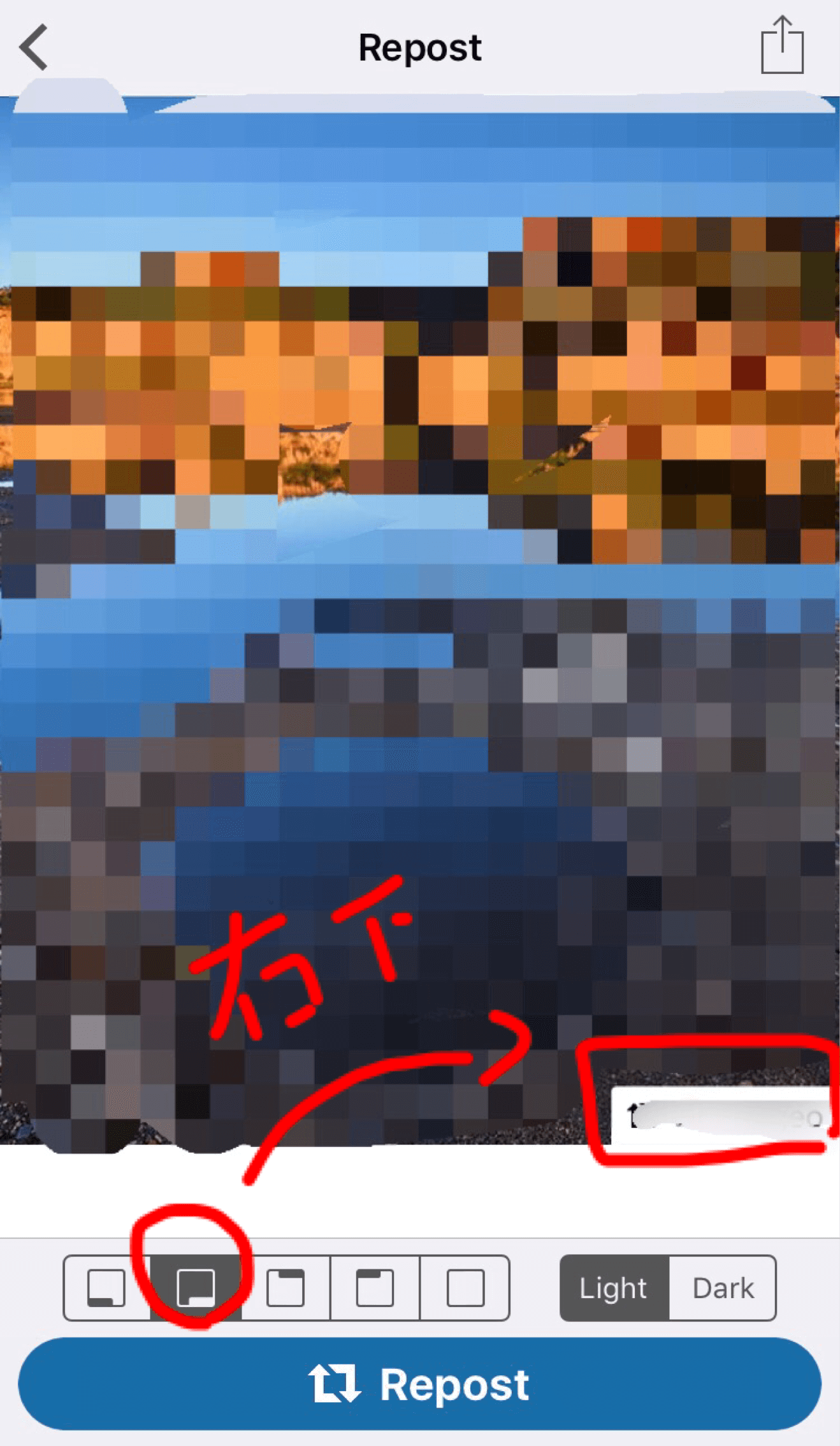 赤丸で囲った部分は誰からリポストしたものかを表示させる部分をシェアしたい画像のどの位置に表示するかを決定するのに使用します。この画像の場合右下に表示されてますね。