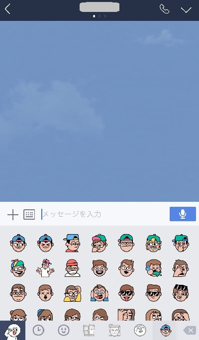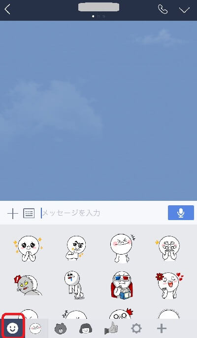 スタンプを選択する画面で画面左下の顔マークをタップします