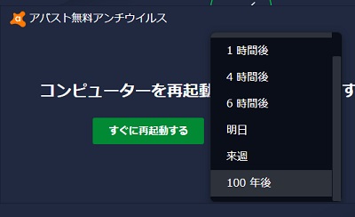 アプリケーションのアップデート後は再起動を求められます。特に何もしていなければ「すぐに再起動する」から再起動を行いましょう。すぐに再起動できない場合は、右側のプルダウンメニューから「100年後」を選んでおけば一切通知が表示されませんのでおすすめです。Avastをアンインストール・再インストールしてみる