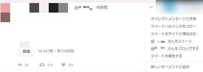 ツイートを通報する「やり方・方法」は、簡単に行う事が出来ます。これは、PC版でも公式アプリでもやり方は似ていますが、なりすましや迷惑ツイートの右上の「v」を利用します。このような一覧が表示されると思いますので、「ツイートを報告する」を選びましょう。