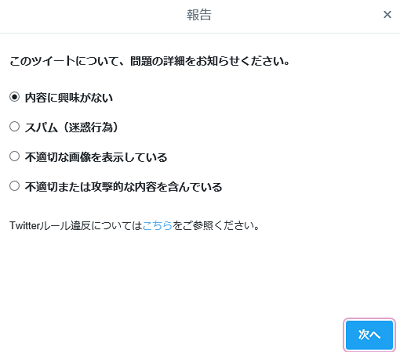 どの様なツイートを通報したいかは、人によって異なりますし、場合によって違って来ます。ですので、この選択肢のどれに当たるかを選択する事が大事になります。