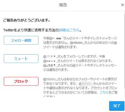 これで通報が完了しますが、何かしらの処分がされるまでは、そのツイートやアカウントは残ったままです。ですので、そのツイートやアカウントを見ない為にも、「ブロックorミュート」をしておくと良いです。