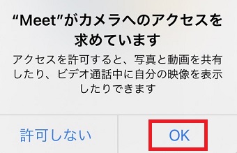 『”Meet”がカメラへのアクセスを求めています』というメッセージが表示されたら画面共有したい方は『OK』をタップします。
