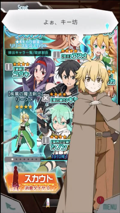 チュートリアルの終わりには「スカウト」といういわゆる、ガチャがあります! キャラクターにはレアリティが設定してあり、 星4 星3 星2 という形で分かれています。 初回は星4確定ガチャなので、戦力的には申し分ないですが、好きなキャラが出るまでやり直すというのもありです!