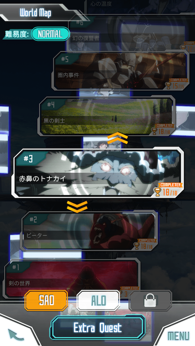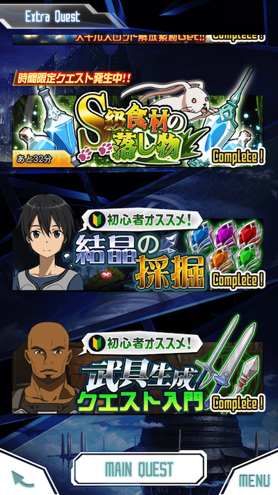 メモデフには ・メインクエスト ・エクストラクエスト の二種類があります。 メインクエストではソードアート・オンライン(SAO)とアルヴヘイムオンライン(ALO)の2種類があります。SAOではソードアート・オンラインについてのストーリーを追体験でき、 ALOではアルヴヘイムオンラインのストーリーを追体験できる!