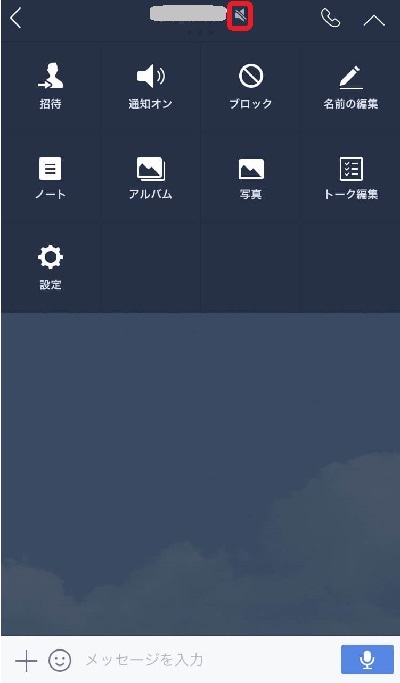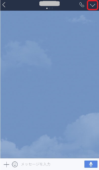 通知音を消したい友だちやグループのトーク画面で右上の下向きのマークをタップし、メニューを開きます。