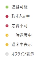 いつでも応答ができる・在籍中の場合は「連絡可能」、作業中や応答できない場合は「取り込み中」・「応答不可」、離席中は「一時退席中」・「退席中表示」、サインインしているけど気づかれたくないという場合には「オフライン表示」を設定することで、アイコンのステータスに反映されます。これらのアイコンに表示される色の意味を覚えておくことで、連絡してはいけないときに連絡してしまうといった行為や連絡していいタイミングを把握することができますよ。