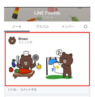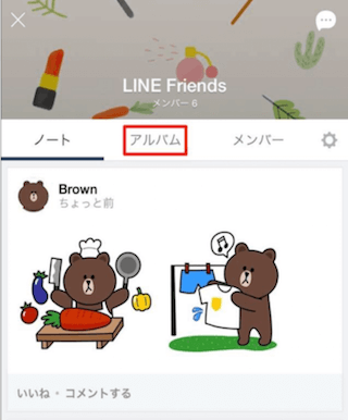 ノートを閲覧するには、友だちリストで希望するグループをタップし、グループプロフィールを表示した後、[ノート]や[アルバム]ボタンをタップしましょう。