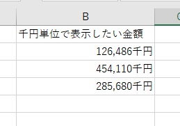 これで、入力した数値を千円単位に変換することができました。あくまで見た目が千円単位になっているだけで実際の数値はそのまま変わらないので、切り上げや切り捨てといった四捨五入を行う必要がないのが嬉しいですね。この方法で千円単位に揃えた場合、他のユーザーが分からなくなってしまうことがないようにヘッダーや近くのセルに千円単位であることを記載しておきましょう。