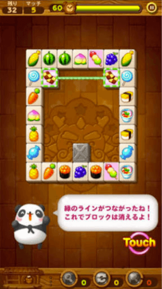 このブロックはバラバラに置いてあるだけで必ず揃うように入っていますので、同じ食べ物をタッチして消していくだけのパズルゲームになっています。