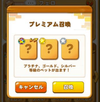 プレミアム召喚では、レアキャラクターのプラチナや、ゴールド、シルバーのペットが必ず出るので是非やってみて下さい!