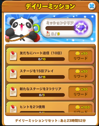 ステージを進めていくのにあたって、様々なミッションがあります。ミッションをクリアするとコインやハートをゲット出来ます。 1日ずつリセットされますので、頑張ってたくさんのミッションをクリアしていきましょう。