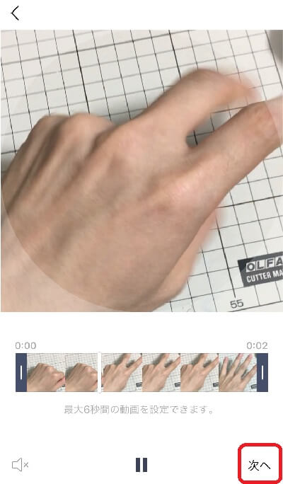 プロフィール画像に使う動画は6秒以下に納めなければならないのでオビの両端の黒いバーで調整します。 調整できましたら右下の「次へ」を押します。