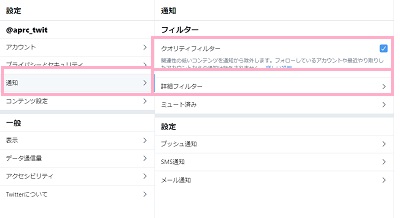 ユーザーアカウントの設定画面が表示されるので、「通知」をクリックして項目を開きます。通知項目の「クオリティフィルター」が有効になっているとTwitterが不要と判断したツイートが通知されないので、必要な場合には有効にしましょう。次に「詳細フィルター」をクリックします。